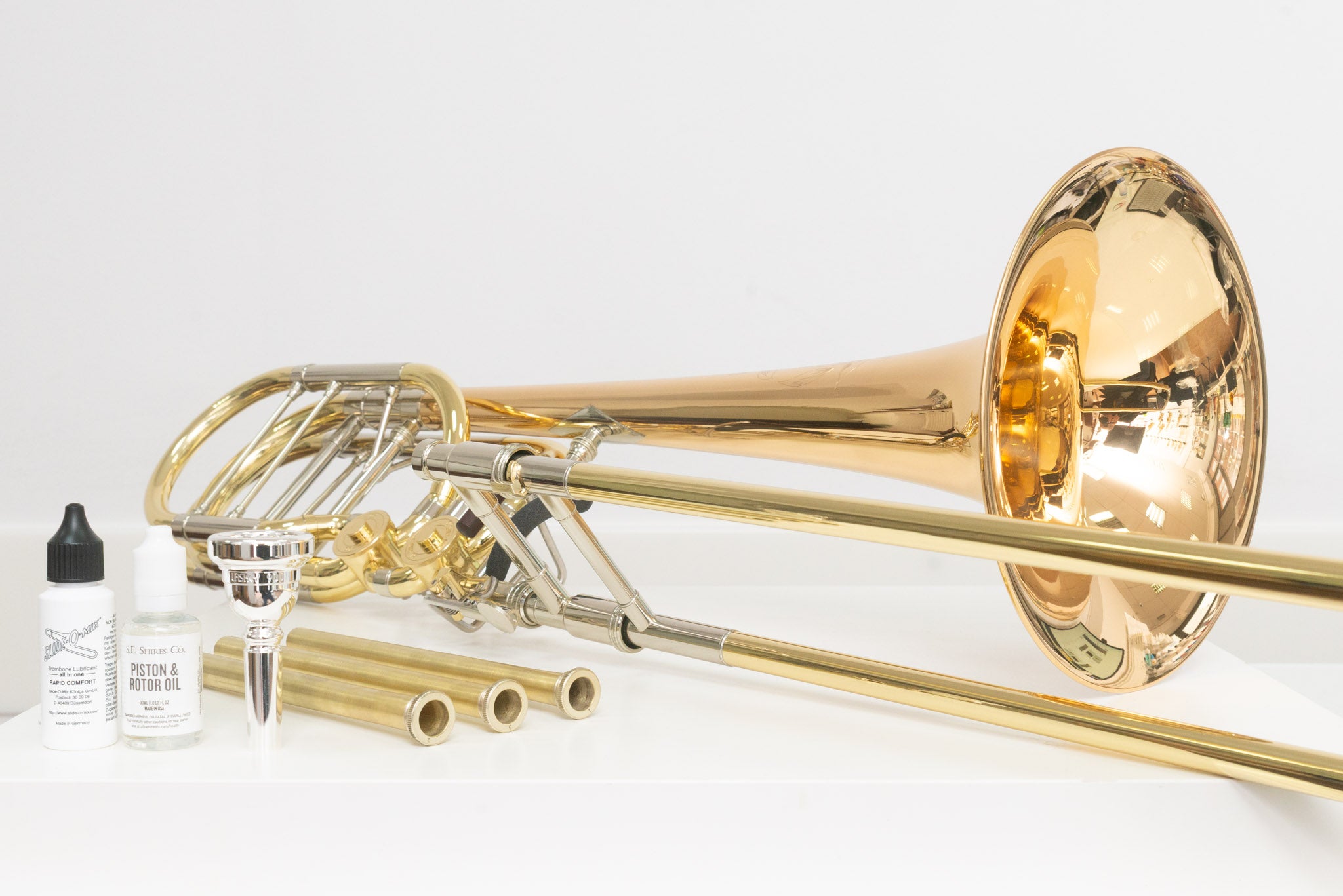 – Das bin ich, Felix Eilers, meines Zeichens professioneller Posaunist und Geschäftsführer. In der Werkstatt und im Verkauf arbeitet Instrumentenbauer Danilo Neun in unserem Geschäft in Mölln. Des Weiteren werden wir von unseren Partnerwerkstätten „Trompetentobi“ unterstützt.