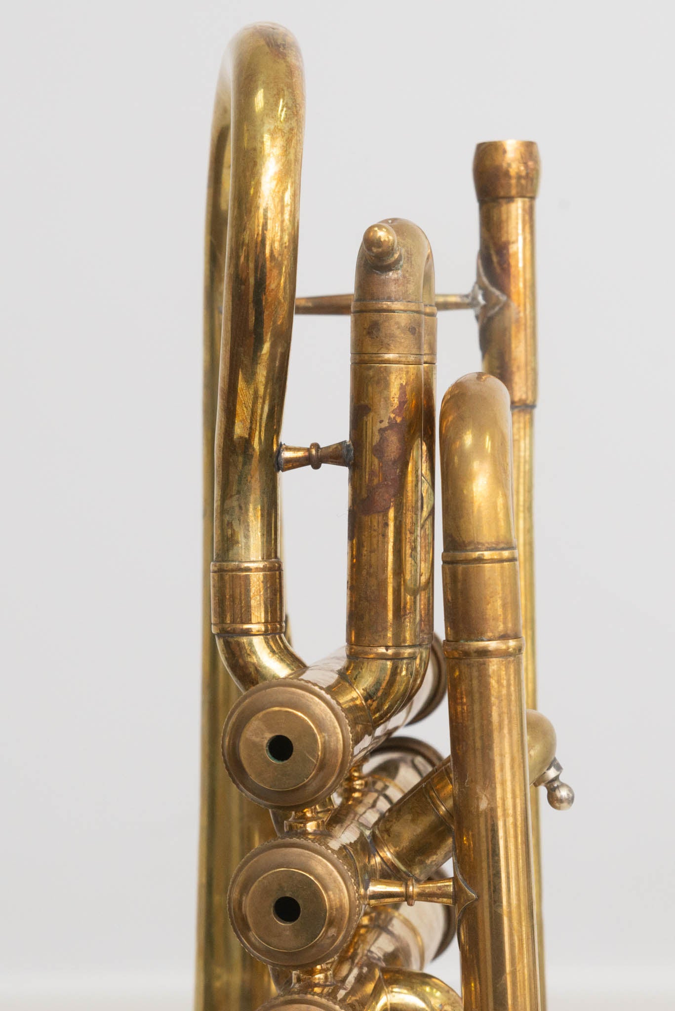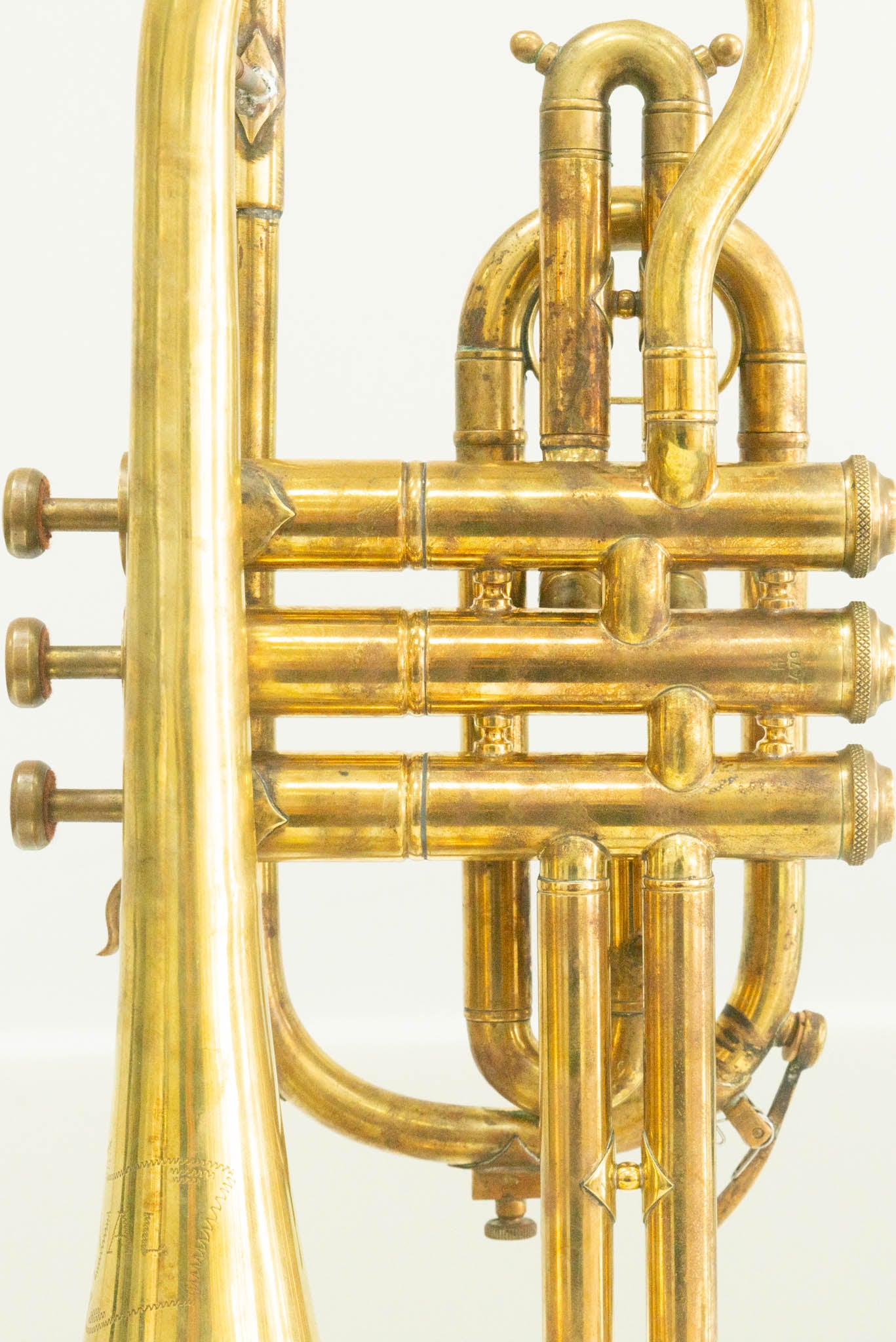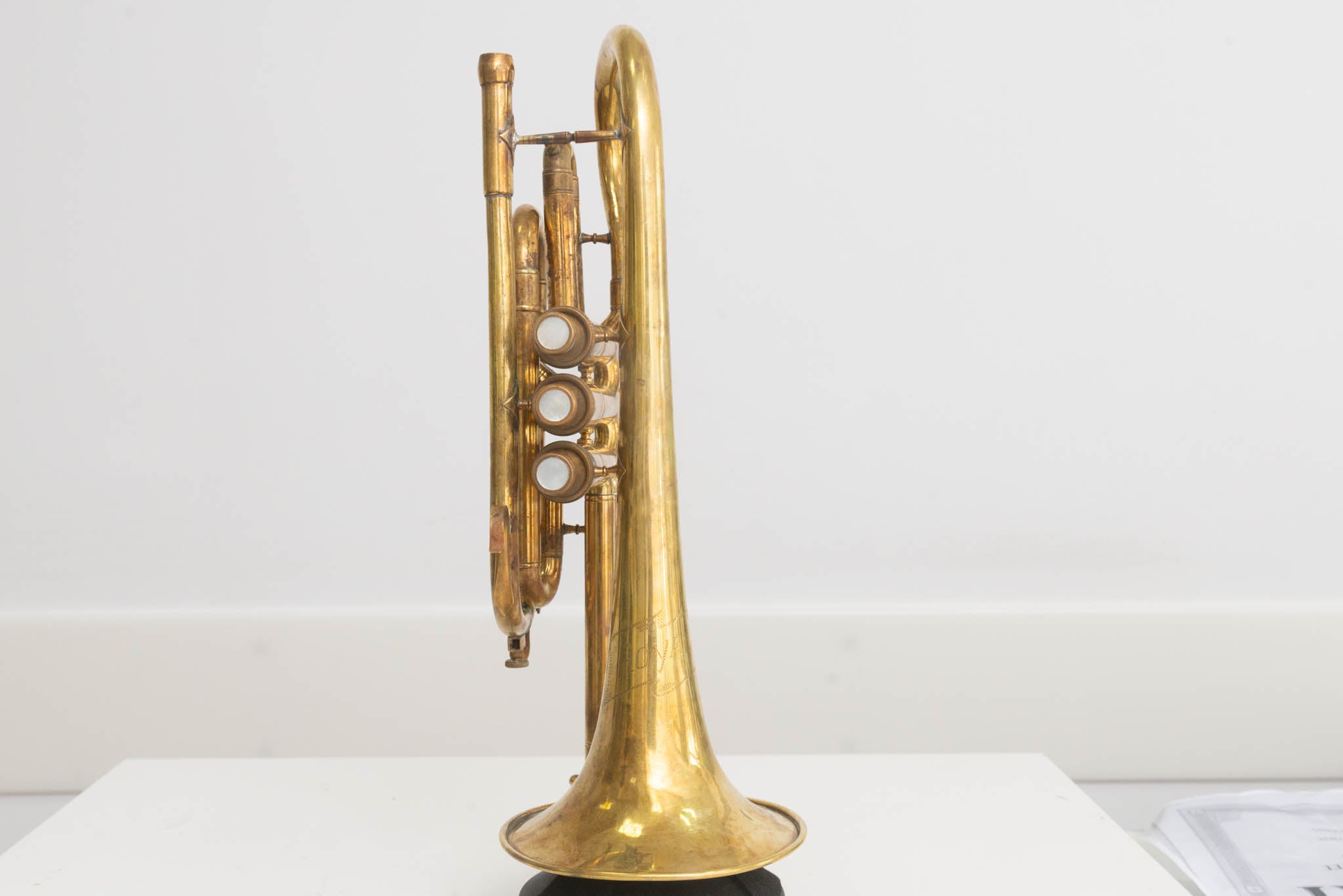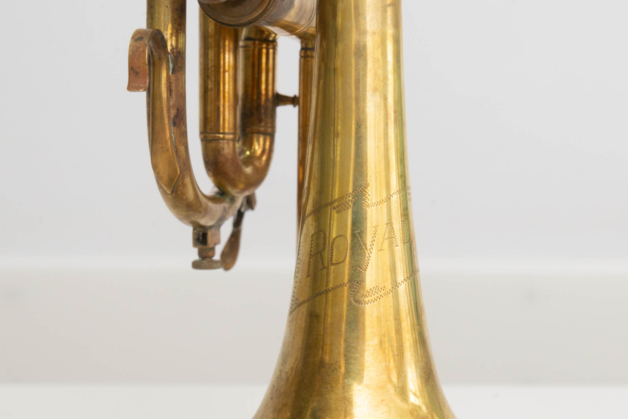 Hier zum Verkauf steht ein „Royal“ Kornett in Bb, ein charmantes Vintage-Instrument mit 12 cm Schallbecher aus Messing. Das Kornett ist unlackiert, wodurch es eine authentische Patina entwickelt hat. Besonders auffällig sind die hübsch verzierten Ventildeckel, die dem Instrument eine individuelle Note verleihen.
